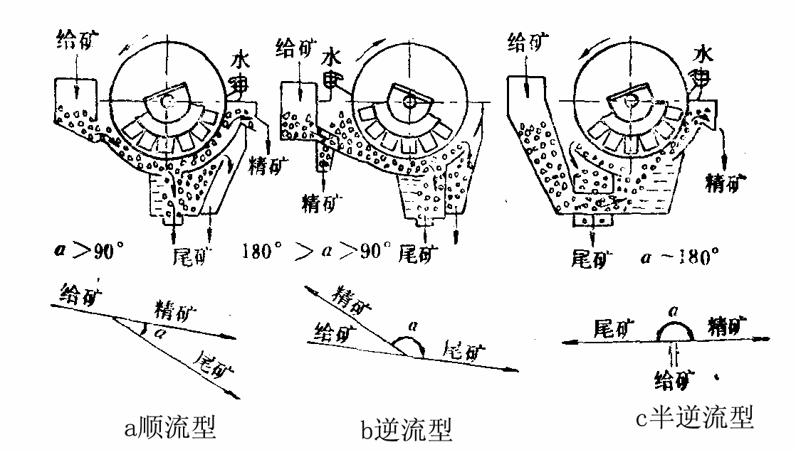 由于磁極的極性沿圓筒旋轉(zhuǎn)方向是交替排列的,并且在工作時(shí)固定不動(dòng),“磁團(tuán)”或“磁鏈”在隨圓筒旋轉(zhuǎn)時(shí),由于磁極交替而產(chǎn)生磁攪拌現(xiàn)象,被夾雜在“磁團(tuán)”或“磁鏈”中的脈石等非磁性礦物在翻動(dòng)中脫落下來,##終被吸在圓筒表面的“磁團(tuán)”或“磁蓮”即是精礦。精礦隨圓筒轉(zhuǎn)到磁系邊緣磁力##弱處,在卸礦水管噴出的沖洗水流作用下被卸到精礦槽中,如果是全磁磁輥,卸礦是用刷輥進(jìn)行的。非磁性或弱磁性礦物被留在礦漿中隨礦漿排出槽外,即是尾礦。以下是下選式的幾種形式: