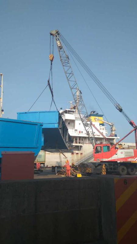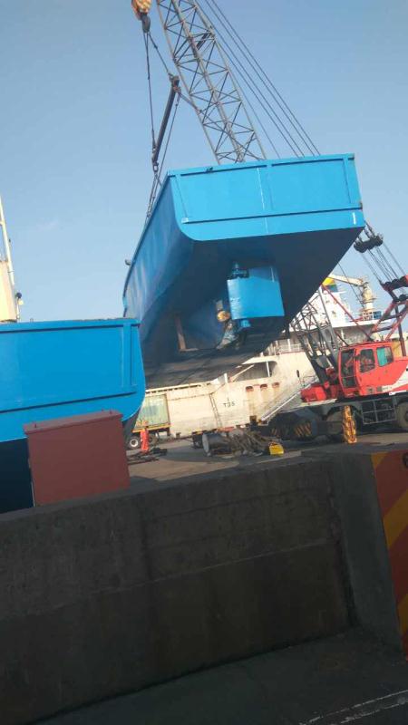 馬爾代夫客戶定做的帶跳板(通行甲板)300噸甲板駁船,從上海港裝散貨船,海運至馬爾代夫馬累港后組裝。